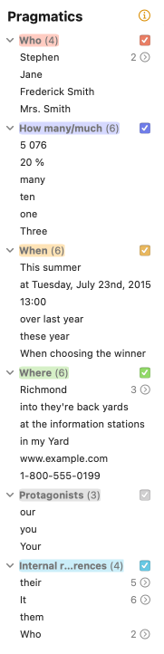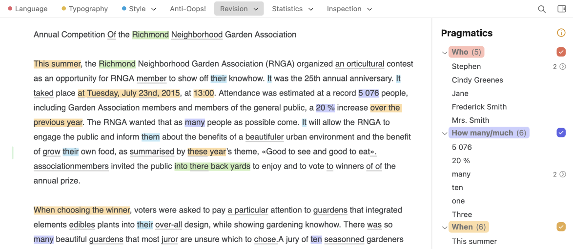 In the example below, the text is being viewed through the Pragmatics filter. This allows you to quickly spot problems related to context (who, when, where, how many/much, etc.).