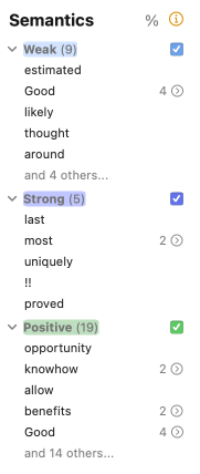 This filter highlights words and expressions whose meaning is imprecise or unclear; it identifies words that are semantically weak or generic in scope. It may be a noun (thing, guy), an adverb (quite, roughly), a verb (seem, think), an adjective (good, decent), a pronoun (somewhere) or another type of weak word. It’s up to you to decide, depending on the nature of your text, whether to make your thoughts clearer by using terms whose meaning is more “rigorous” or precise.