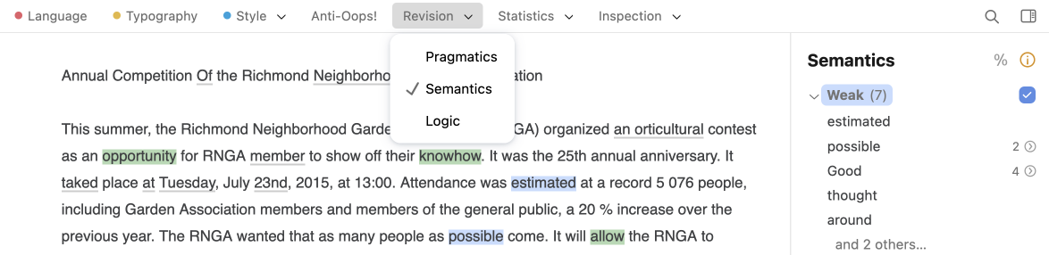 After the correction process has been completed, submit your text to the Revision view to inspect it from a number of different angles. The Revision view offers a variety of filters that address some particularly delicate features of your text. If the text is important, you should consider consulting each of these filters. Revision filters examine the text from three important linguistic perspectives: pragmatics, semantics and logic.