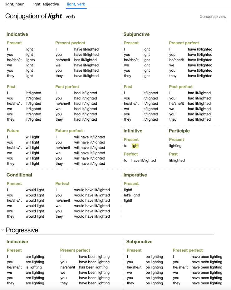 By default, the dictionary of conjugations displays a condensed table featuring only the principal forms of a given verb, along with any auxiliaries. This view may well provide all the information you need, as English verbs take identical forms for many tenses and aspects. However, you may also find it useful to click Show all in the top right corner of the main panel, revealing an exhaustive list of conjugations for every person, tense and mood. Click Condense view, also in the top right corner, to return to the condensed table.
