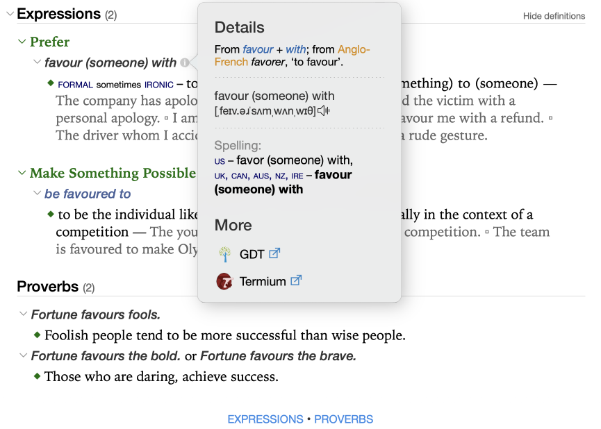 Where applicable, the hide/show chevron in front of the meaning label lets you collapse the list of expressions so you can easily get an idea of all available meanings. Click the hide/show chevron beside the given meaning or meanings of the headword to expand selected expressions, sorted according to their syntactic category. The Hide definitions option to the right of the section title hides the definitions, examples and labels to show only the expressions; click Show definitions to return the entries to their original state.