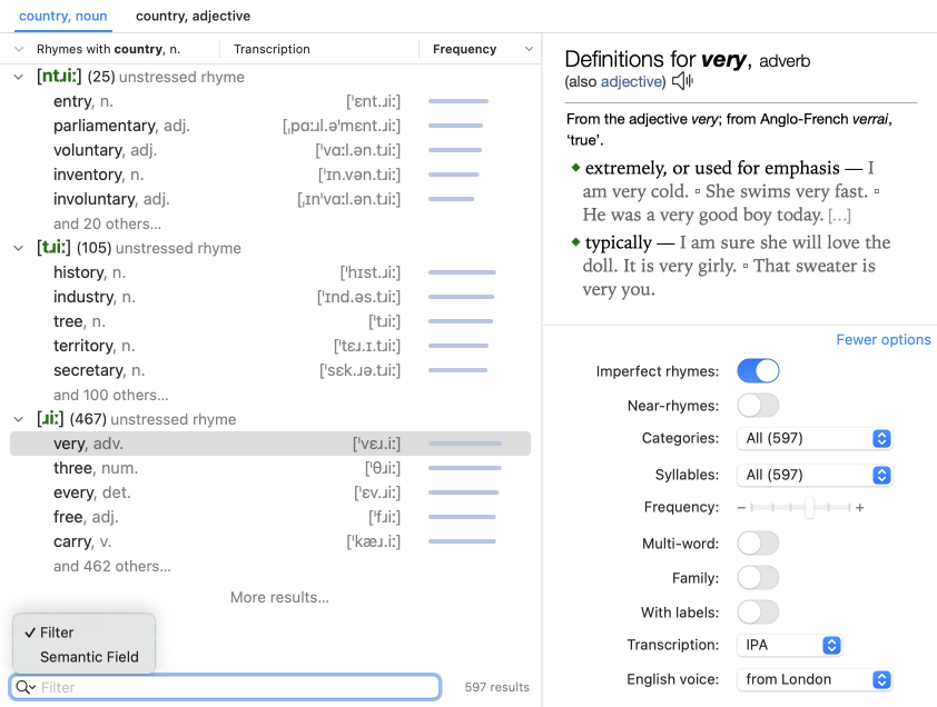 When the Imperfect rhymes or Near-rhymes options are enabled, new sections are added to the list of results, and the type of imperfect rhyme or near-rhyme is specified next to each one (identity, assonance, etc.). Both options are disabled by default, except in the case of words without any perfect rhymes; for these words, the Imperfect rhymes option is enabled by default. Regardless of the number of results shown by default, it can always be useful to widen your search to words that are more distantly related in terms of their phonetics.
