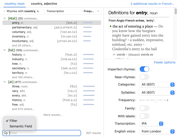 When the Imperfect rhymes or Near-rhymes options are enabled, new sections are added to the list of results, and the type of imperfect rhyme or near-rhyme is specified next to each one (identity, assonance, etc.). Both options are disabled by default, except in the case of words without any perfect rhymes; for these words, the Imperfect rhymes option is enabled by default. Regardless of the number of results shown by default, it can always be useful to widen your search to words that are more distantly related in terms of their phonetics.