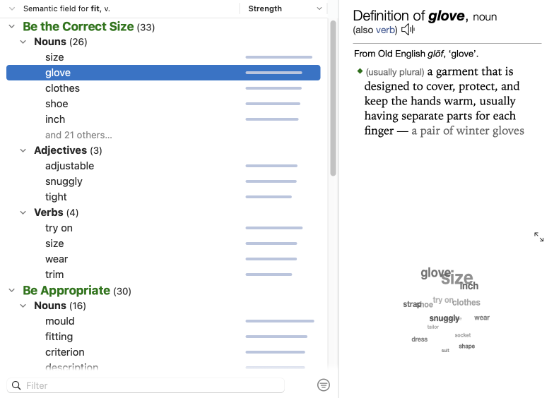 The search filter at the bottom of the window lets you search for a string of characters in the list of words belonging to the semantic field.