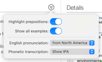 The button in the top right corner of the main panel of the dictionaries of definitions, synonyms and conjugations lets you configure some of the content (phonetic transcriptions, usage labels for synonyms, prepositions in examples, etc.), depending on the dictionary in question. Configuration options for each dictionary are described in the corresponding sections.