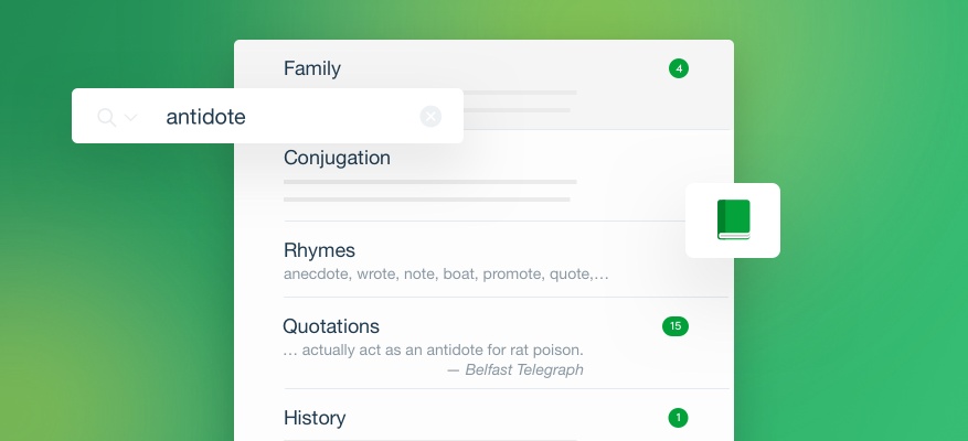 In fact, Antidote comprises multiple dictionaries, all of whose entries are displayed within a unified interface. Whether it be for definitions or synonyms, combinations or semantic fields, families or rhymes, Antidote’s dictionaries offer a lexical reference work of unparalleled richness, variety and consistency.