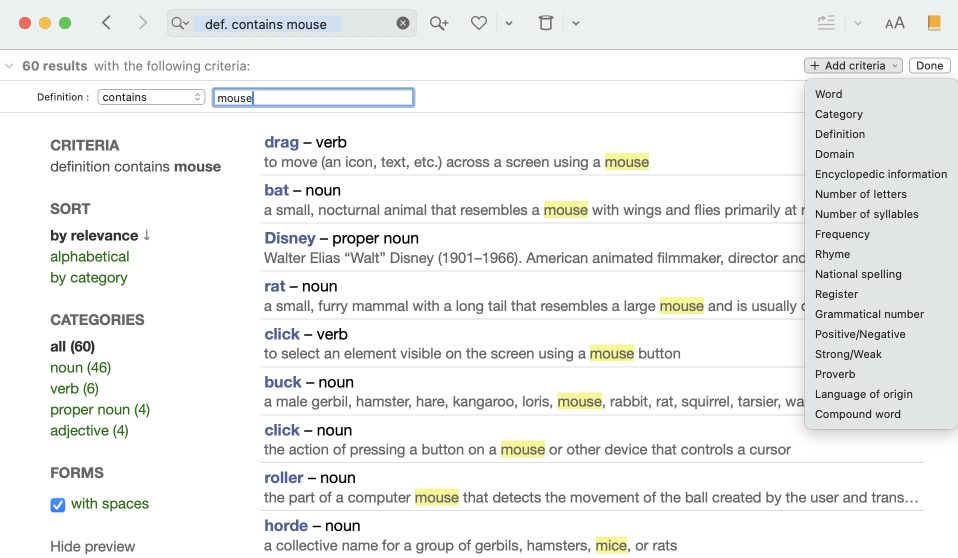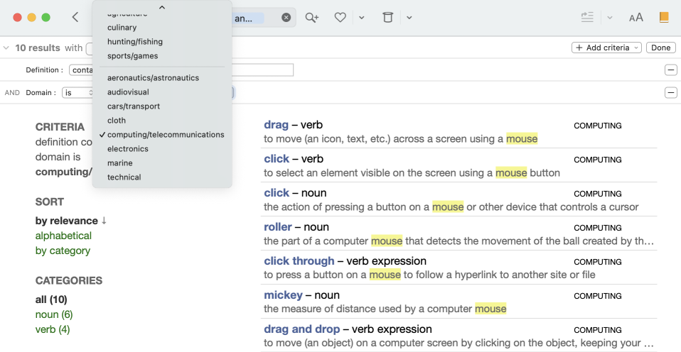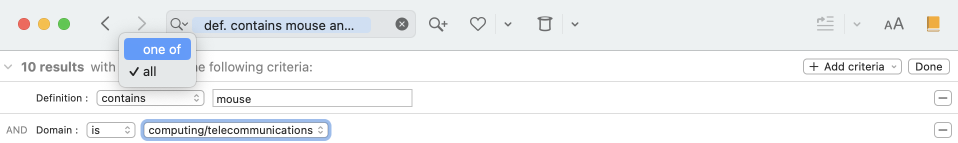 Suppose you have already searched for all the words whose definition contains the word mouse (criterion Definition containsmouse), but you want to limit the results to those that contain the computer-related term. Click the + Add criteria button in the top-right corner of the window and select the Domain criterion.