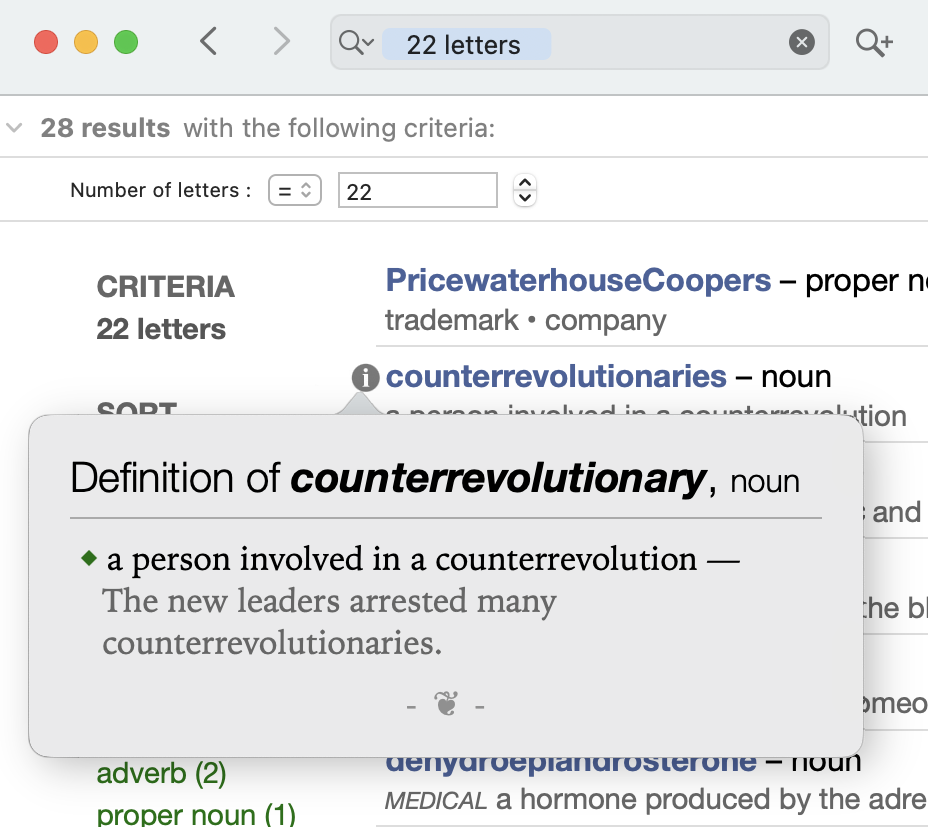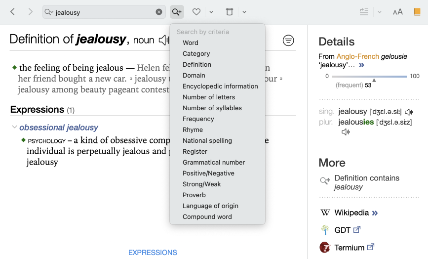 Search by criteria is a powerful tool that will let you explore and make the most of Antidote’s dictionaries. You can combine a series of filter criteria and see the results change as you enter each criterion.