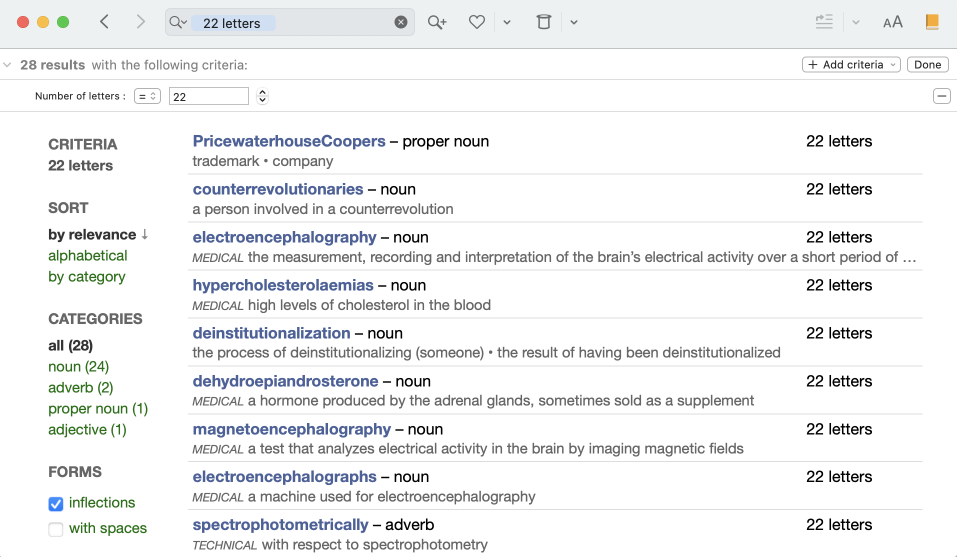 Number of letters: Search for words with a number of letters equal to, smaller than or larger than a given number.