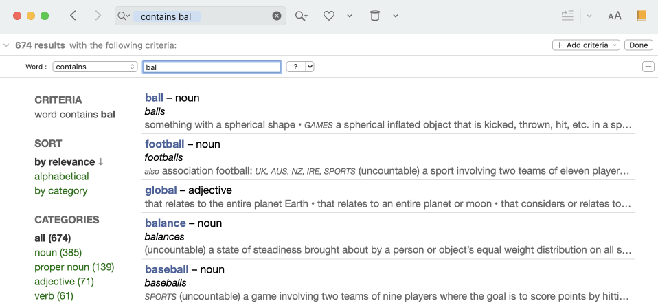 After choosing the contains parameter, for example, enter a string of characters in the headword search field. If you type bal, you will see football, ball, global, balance, etc.