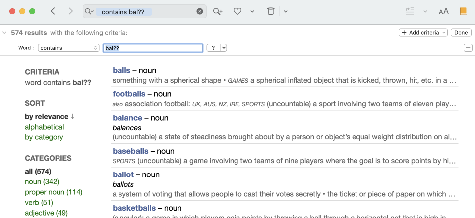 To close the search by criteria panel and return to the last dictionary you consulted, click the Done button in the upper right-hand corner of the window.