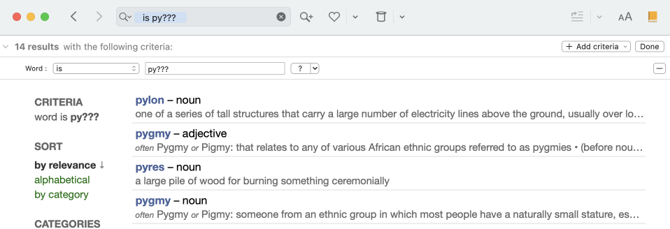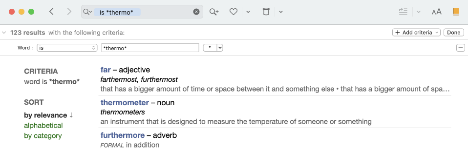 In some situations, you may want to search for a word even if you don’t know all the letters. Maybe you’re missing a five-letter word starting with py to finish your crossword, or you’re writing an assignment on heat sources and are looking for words containing the string thermo. Searching with variables is an excellent way to find the word or words you’re seeking.