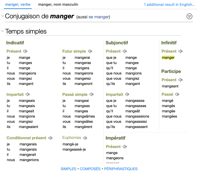 Antidote’s French dictionary of conjugations provides all the conjugations for several thousand French verbs. The dictionary displays a complete conjugation table for each verb that includes all the conjugated forms in all the tenses and moods, both for the simple form of the verb and the pronominal form (if it exists). The verb form typed in the headword search field is highlighted in the table to make it easier to find. Click one of the verb forms in the table to select it, then click the button to insert it into your text. To make it easier to consult the table, the numerous conjugated forms are grouped into simple tenses (temps simples); compound tenses (temps composés), including the auxiliary with which the verb is conjugated; and periphrastic tenses (temps périphrastiques).