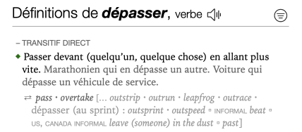 Connected translations Certain lists of translations are followed by an ellipsis enclosed in square brackets, indicating that connected translations are available. They can be revealed by clicking the ellipses and are displayed in a lighter grey font. These translations are generally less relevant than the principal translations for a number of reasons, such as relative rarity, a difference in register, or a more restricted meaning. Still, they may be useful in certain contexts. For example, the first definition of the French verb dépasser includes a number of connected translations, some of which are informal or specific to a particular region. To hide the list of connected translations, simply click the ellipsis again.