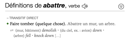 Usage contexts — Some translations are preceded by an indication of the context to which they apply, shown between parentheses and in roman type. For example, the first definition of the French word abattre can have a number of appropriate English translations depending on the context. Accordingly, many of the translations include contexts such as “(arbre) fell”.