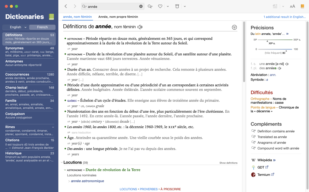 Antidote opens its French dictionaries automatically when you type a non-ambiguous French word in the headword search field. You can also open them yourself from any of the English dictionaries by clicking the French button located above the list of dictionaries. This will take you from an English word to the corresponding entry for its French translation. If many translations exist for the word, a chevron to the right of the French button will appear, which you can click to select the entry you would like to view. The default translation shown is the most frequent one.