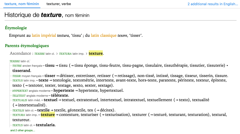 - The etymologically related words (Parents étymologiques), beginning with the main etymon, form a sort of family tree that traces the word’s evolution. For example, for the French word texture (from the classical Latin texere, “to weave”), the etymologically related words include the Old French tistre (which gave rise to the French noun tissu), the Middle French tissir (from which the modern French verb tisser is derived), the medieval Latin textualis (from which modern French gets the adjective textuel), etc. All these words share a common etymon: the Latin verb texere. To clarify the list of etymologically related words, a simple line of derivation is also included, which indicates sequentially, from the oldest etymon to the most recent, the major steps in the headword’s evolution. The arrow can be read as meaning “gave rise to, produced, formed”.