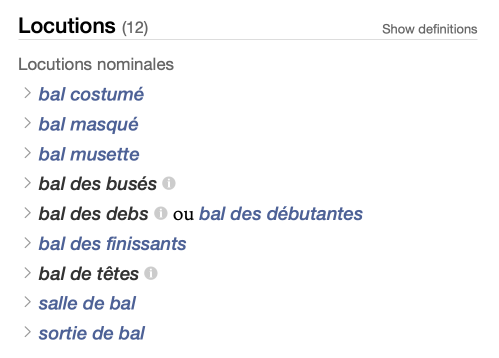 • Expressions are displayed in blue or black text, and you can quickly expand or collapse the definition by clicking the hide/show chevron. Click an expression in blue to consult its entry in the dictionaries and learn more about it (synonyms, combinations, quotations, etc.). Expressions in black possess additional information on their use (inflections, notes, external resources, etc.), which can be seen in a tooltip by clicking the  icon.