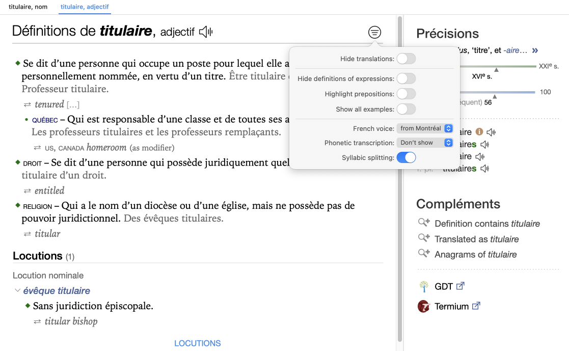 For example, in the French adjective entry titulaire, each of the four definitions has its own translation. In the context of religion (fourth definition), the English translation is titular. Clicking this translation once will cause a tooltip to appear showing the religion-specific English definitions of titular. This allows users to compare the French definitions with the English ones. Double-clicking the translation will open the English entry for the word in question.