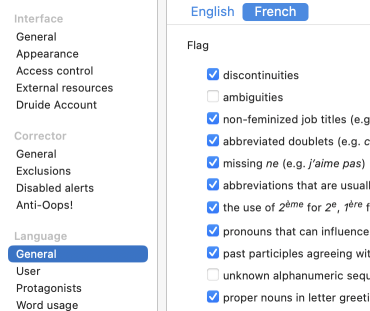 The English and French settings are found in the same window, which you can access in different ways: via the menu bar, by selecting Antidote 12 > Settings or Corrector > Settings; from the corrector, by clicking the settings icon () in the toolbar or by clicking the Setting link that appears in the tooltips associated with certain detections; or by using the keyboard shortcut Cmd + r on a Mac or Ctrl + r in Windows. In the Settings window, the different sections are displayed in the panel on the left. Settings that concern the French Module, specifically, can be found in the following locations: Interface (General panel), Language (General, User, Protagonists, Word usage, Word choice, Capital letters, Punctuation and Spelling rectifications panels) and Typography (General, Spaces and Conventions panels). At the top of these panels, two tabs in blue let you view the settings particular to each language; clicking the French button displays the French settings and vice versa. However, the settings in the Protagonists and Spelling rectifications panels only apply to the French Module.