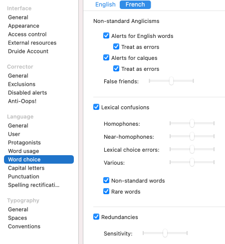 Antidote distinguishes three different types of lexical confusions: homophones, i.e. words that are pronounced alike but are spelled differently, e.g. ballade and balade; near-homophones (paronymes in French), i.e. words that have a similar pronunciation but a different meaning, e.g. luxurieux (meaning “lustful”) and luxuriant (meaning “lush”); and lexical errors, i.e. various types of incorrectly used words, e.g. téléphone for appel téléphonique. Once again, you can choose from three sensitivity levels for these settings: minimum, intermediate and maximum.