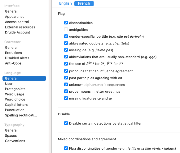 There are two additional settings you can enable in this section: Non-standard words, to flag terms and expressions that some linguistic authorities find objectionable, e.g. ceci dit for cela dit; and Rare words, to flag rare words that may have been entered inadvertently instead of a more common word, e.g. paissance (“grazing”) might be a typing error for naissance, puissance, plaisance, etc.