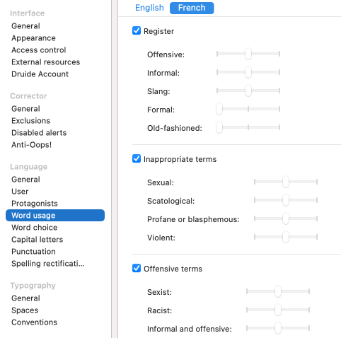 Depending on your settings, the corrector will attempt to identify and assess the appropriateness of those terms that belong to the various registers that Antidote recognizes in French. These include offensive, e.g. merdeux for “voyou”; informal, e.g. fortiche for “habile”; slang, e.g. que dale for “rien”; formal, e.g. forfaire for “manquer à”; and old-fashioned, e.g. consomptueux for “atteint de tuberculose”.