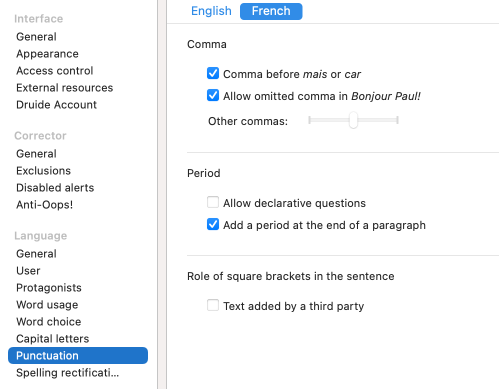 You can tell Antidote to flag the absence of a comma in a number of other contexts, e.g. after an adverbial complement in sentence-initial position. Here too there is a three-position slider allowing you to adjust the sensitivity of the setting.