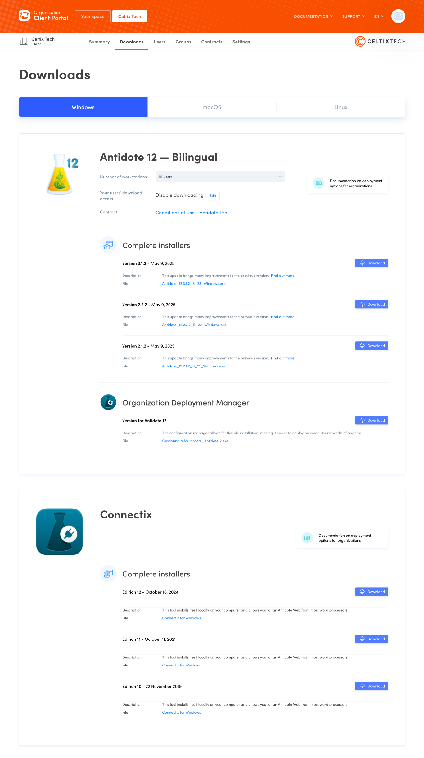 The Downloads tab has all the files needed to install Antidote in accordance with your per-device license or your subscription.