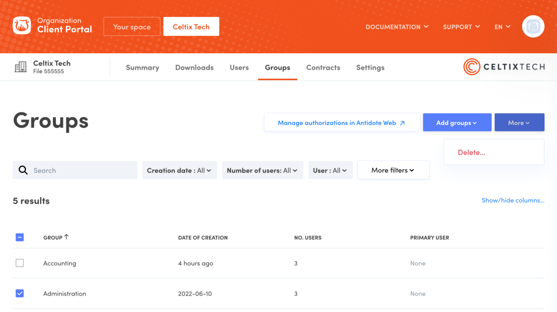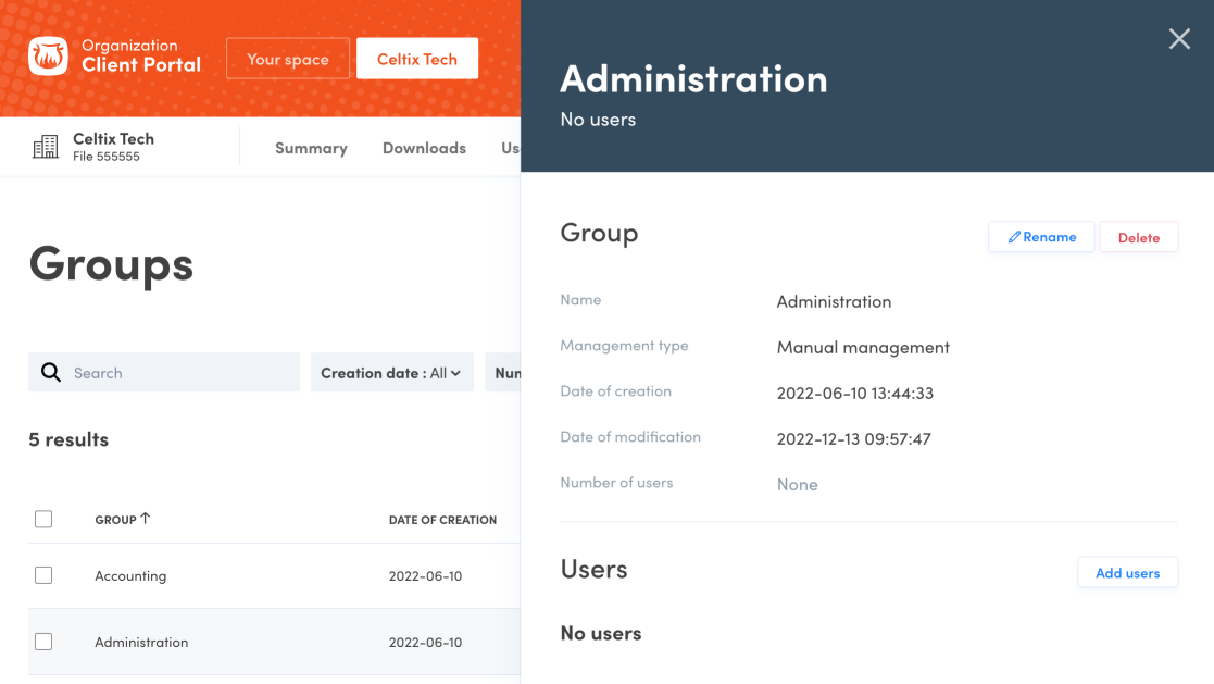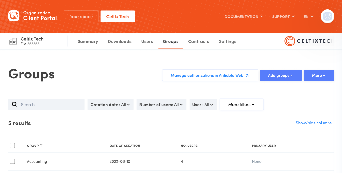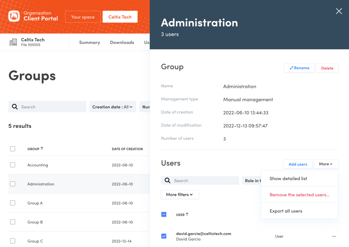 - Open the Groups tab in your Organization Client Portal (A).