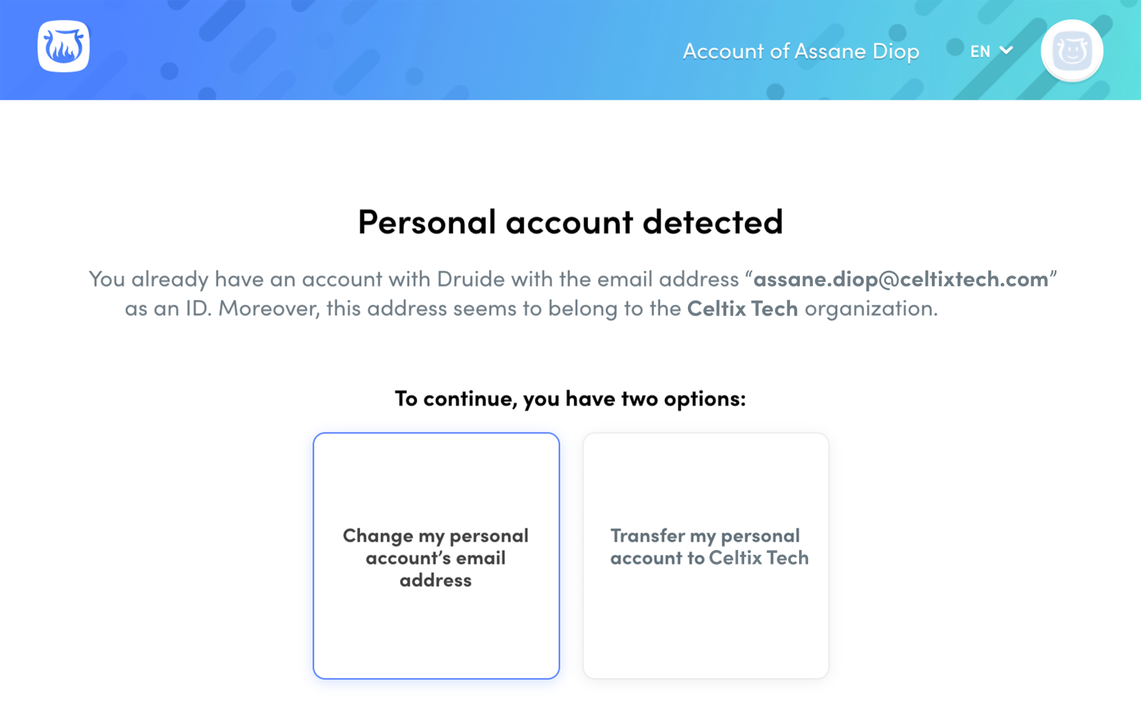 If an organization invites a user who already has a Druide account and the individual has an email that uses the organization’s domain name, they will have to choose between two options.