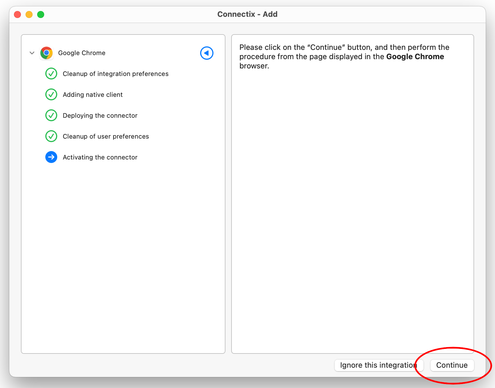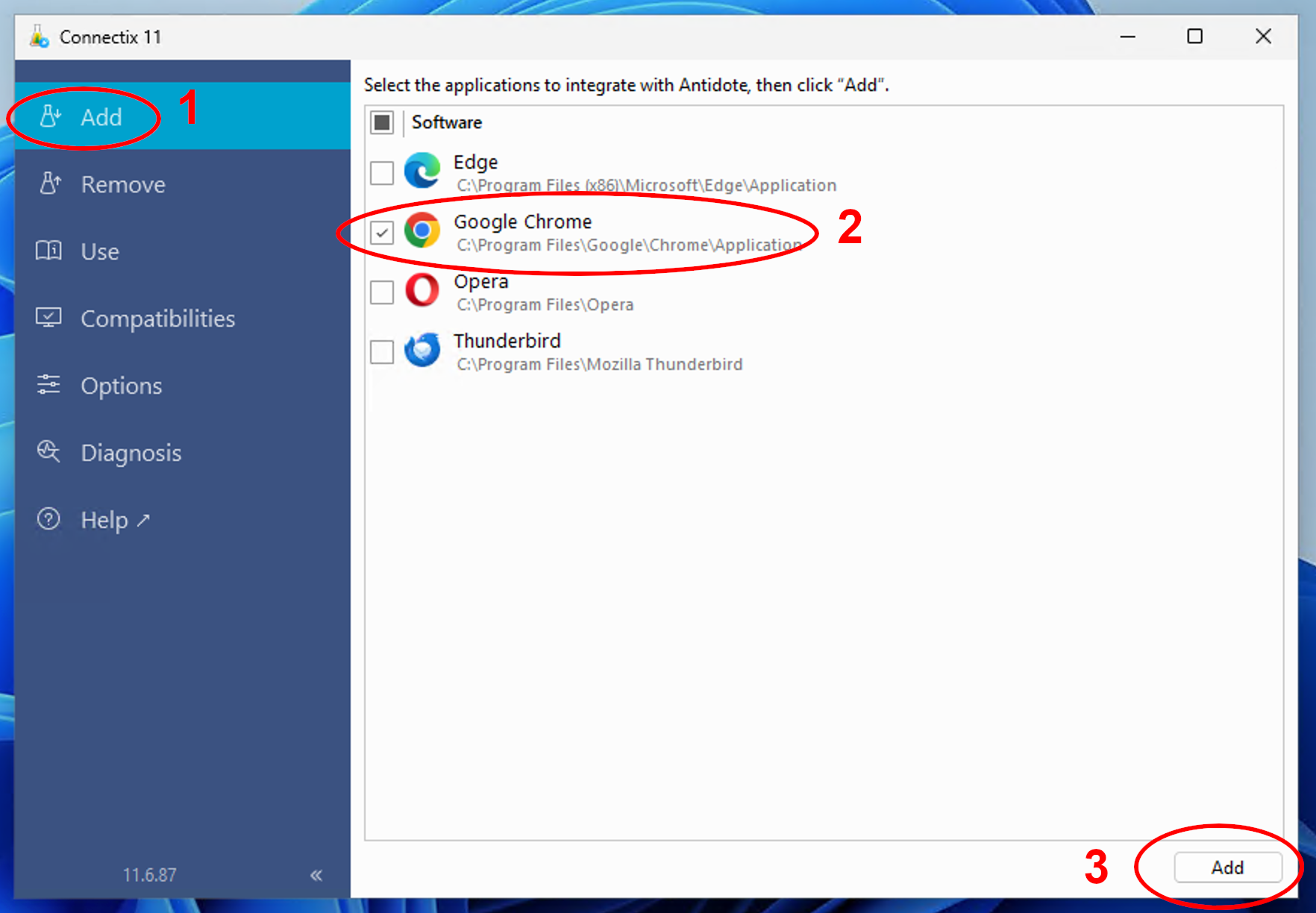 - In Connectix, select the Add tab (1), then check Google Chrome (2). Click on Add (3).