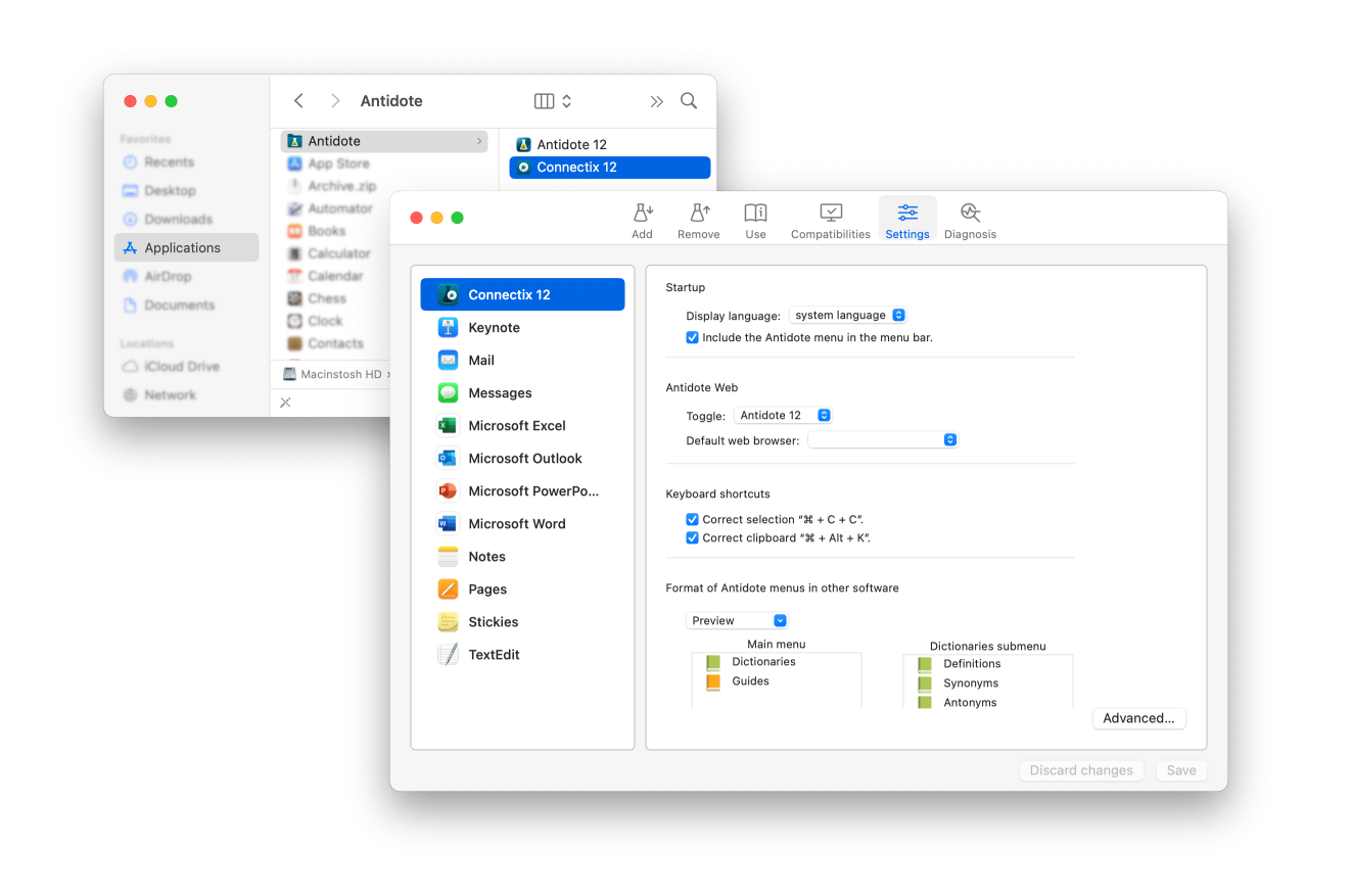 Antidote’s four main language resources can be found at the top of the menu, giving you a quick way to access them.