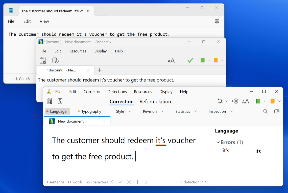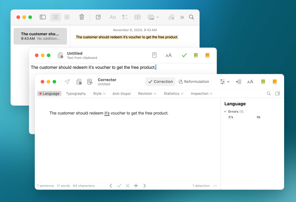 Choosing Correct selection from the menu will open Antidote’s corrector with an internal document to copy and directly analyze the text selected on the screen.