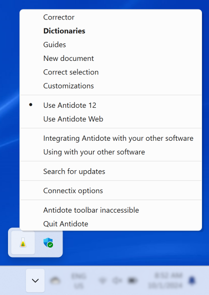 The appearance of this menu item varies depending on the application window currently active on your computer. For applications like Notepad that support the Antidote toolbar, for example, it reads Hide/Show the Antidote toolbar for Notepad. Otherwise, the option is greyed out and reads Antidote toolbar inaccessible.