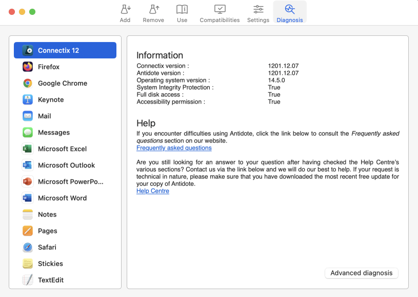 The Diagnosis tab (6) in Connectix contains information useful for technical support: the version of Antidote and Connectix you are using, your operating system, compatible software (location, architecture, version, execution status, etc.) and its connector (integration status, version, etc.).