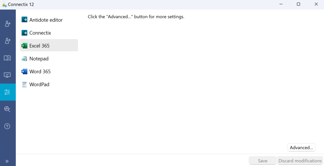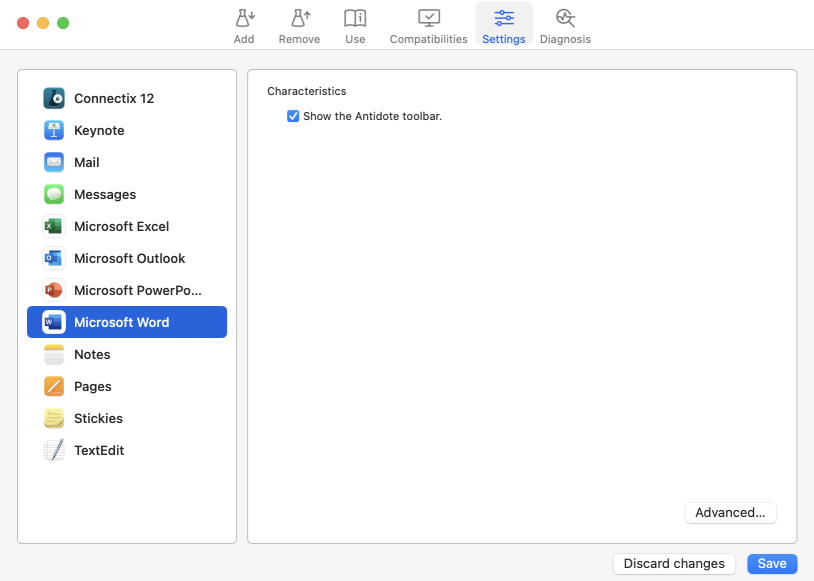 The settings, which vary by application, manage how Antidote appears in the application in question. In some cases, a button makes advanced settings accessible, but they may affect Antidote’s performance and stability. So please use caution when adjusting them, or better still, only adjust them when following instructions provided by our help centre.