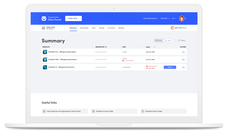 Go to your Organization Client Portal to access your complete file: your licenses, your subscriptions, downloadable installers and user-management tools.