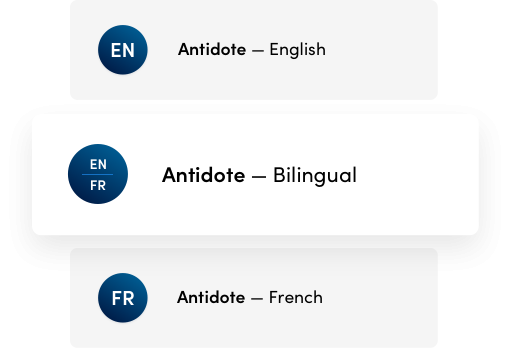 What’s more, Antidote adapts its detections and recommendations to each language, as well as its different varieties. Don’t worry, Antidote knows it’s la table and not le table and that people outside of Quebec don’t buy their essential supplies from a dépanneur.