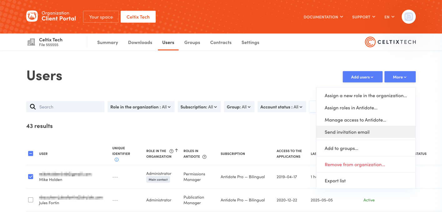 If you did not send users an email invitation to access Antidote when you created their accounts manually or by file import, follow the steps below to send Druide’s invitation: