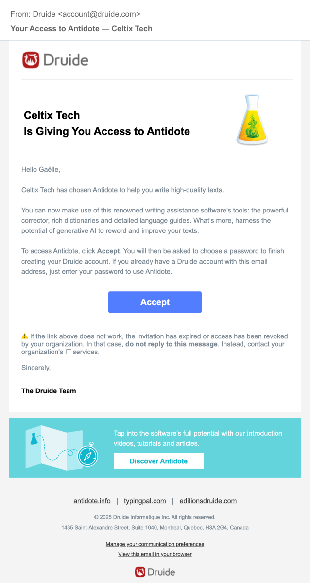 | By invitation | Druide sends the invitation automatically. Here is an example of the email users will receive. |