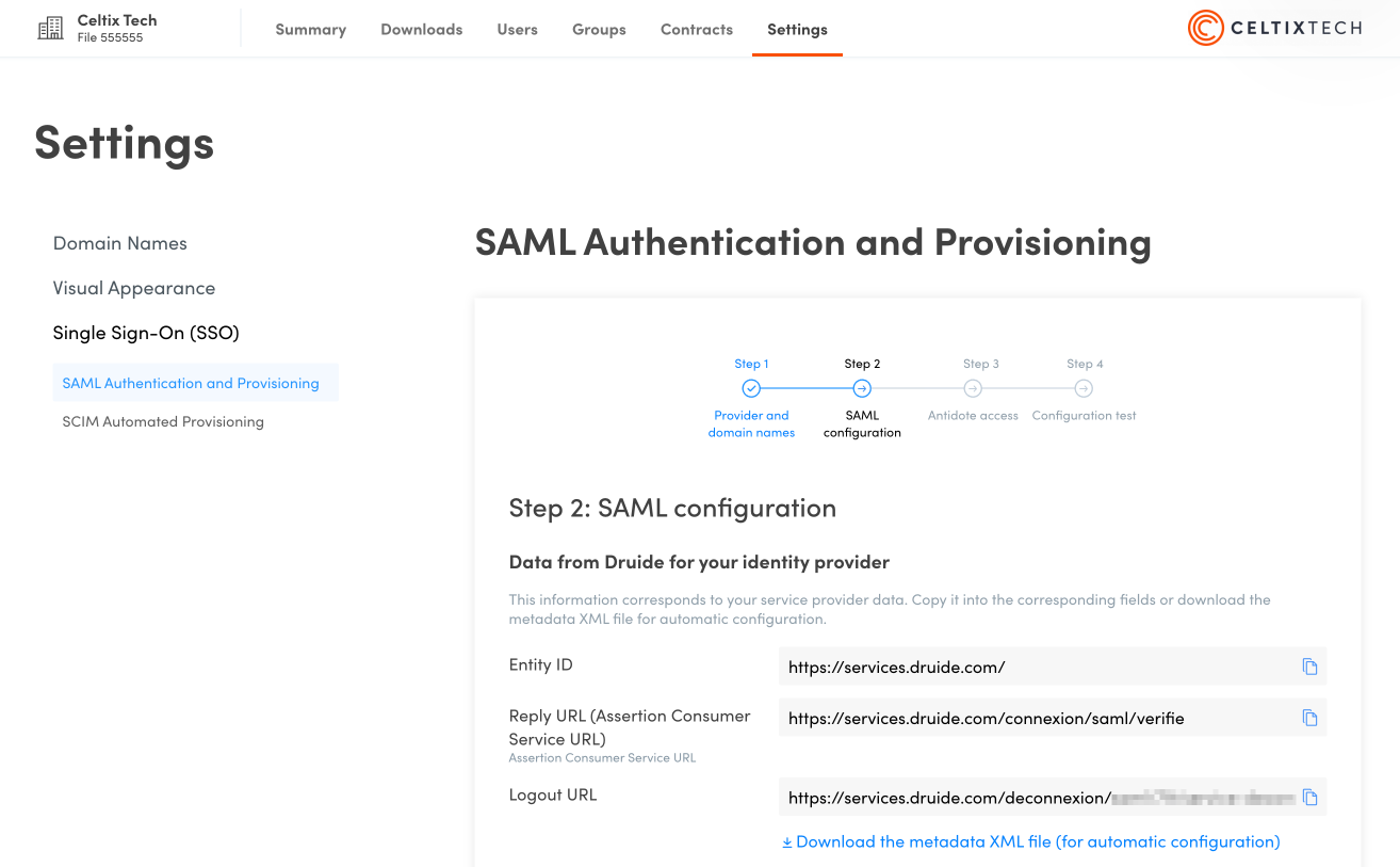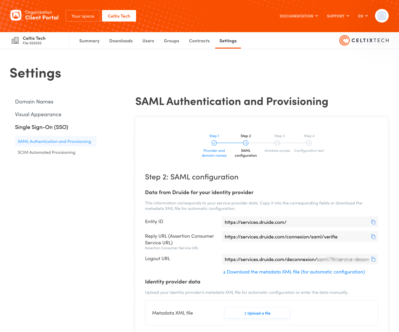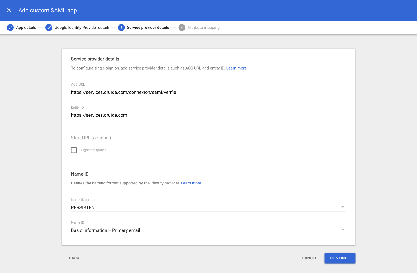 7. Leave this window open and start configuring Google Cloud in a new browser window. You will need to copy-paste some of the information under Data from Druide for your identity provider in the following steps.