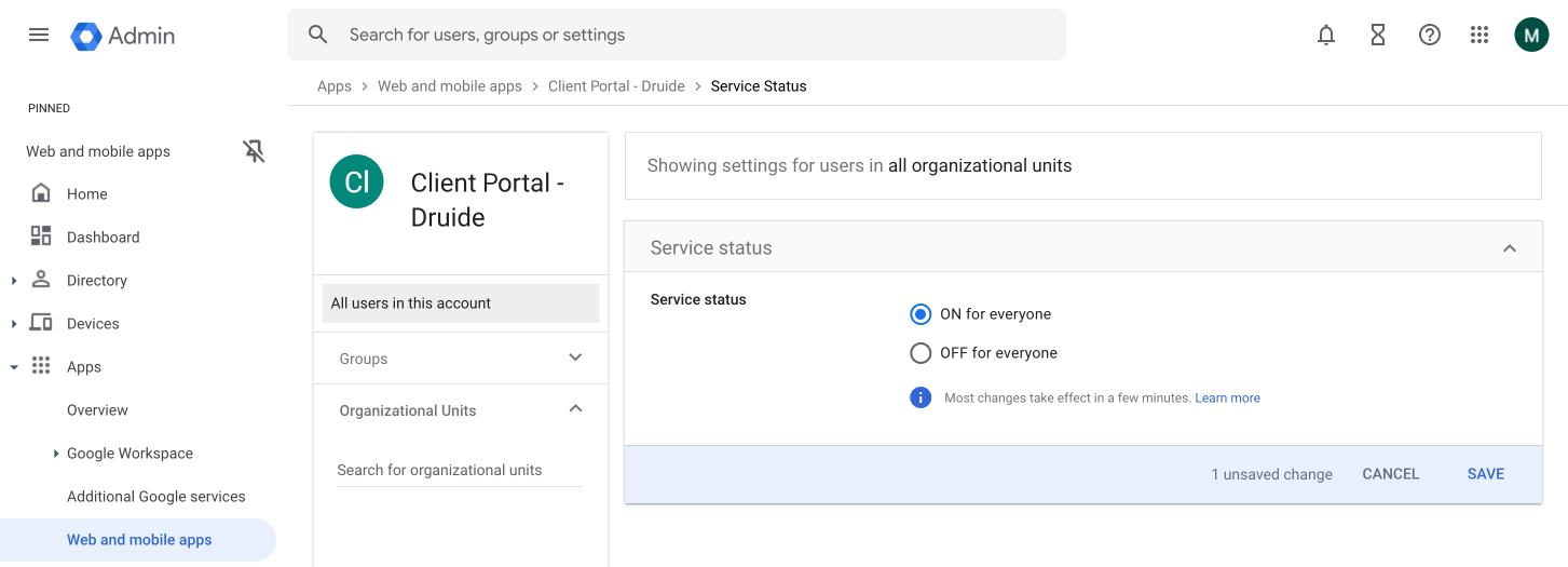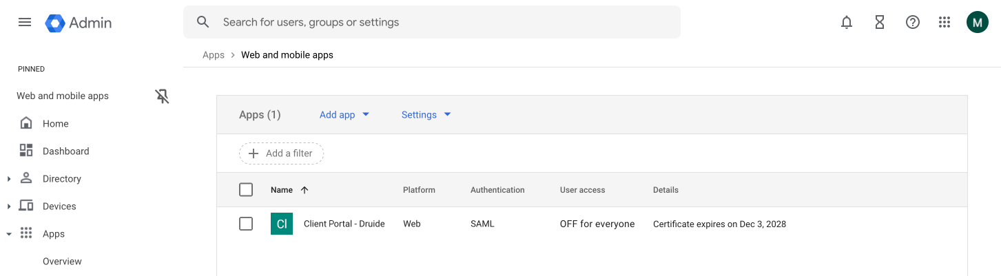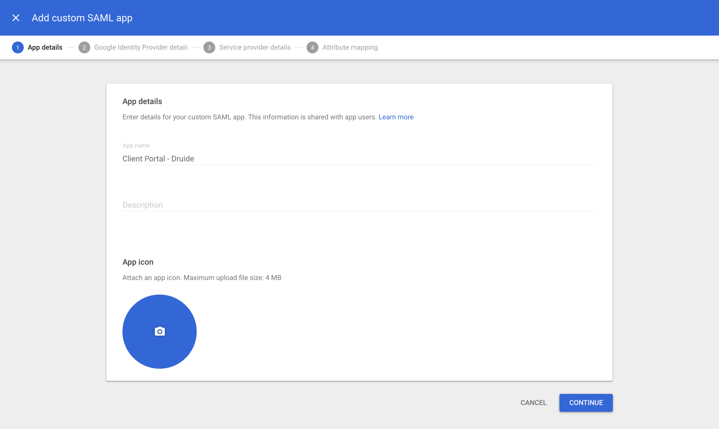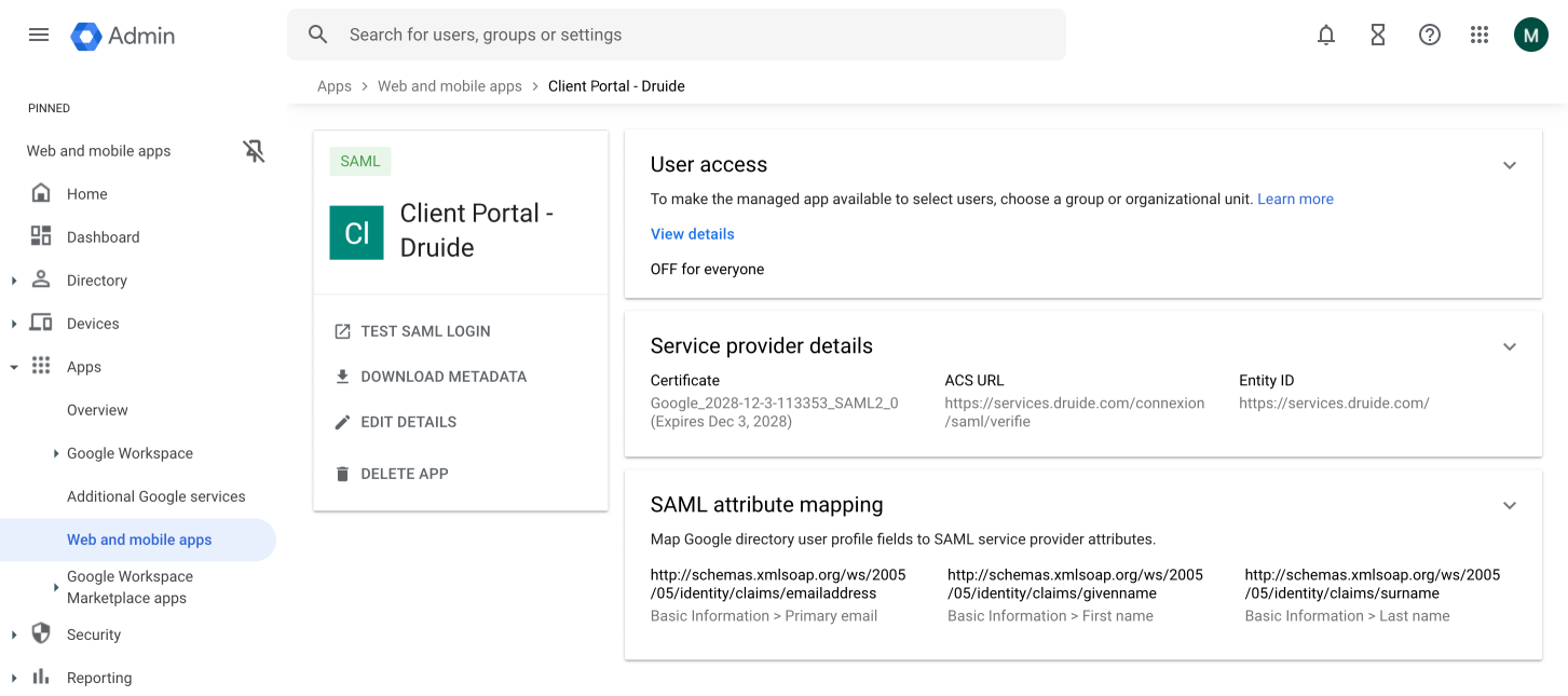 7. Leave this window open and start configuring Google Cloud in a new browser window. You will need to copy-paste some of the information under Data from Druide for your identity provider in the following steps.