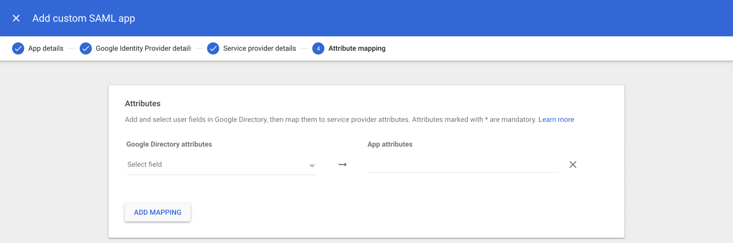4. On the next screen, click Add Mapping (A), then click the Select field menu under Google Directory attributes (B) to define each of the user attributes in Google Directory.