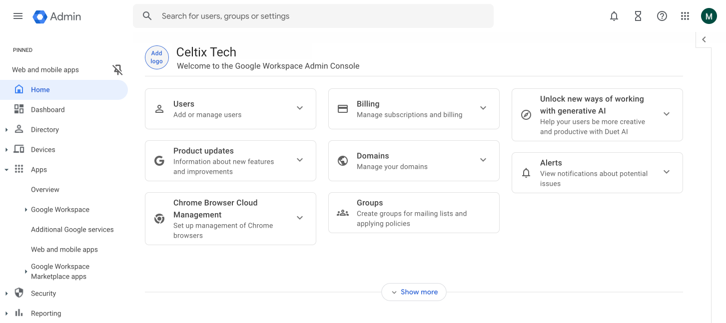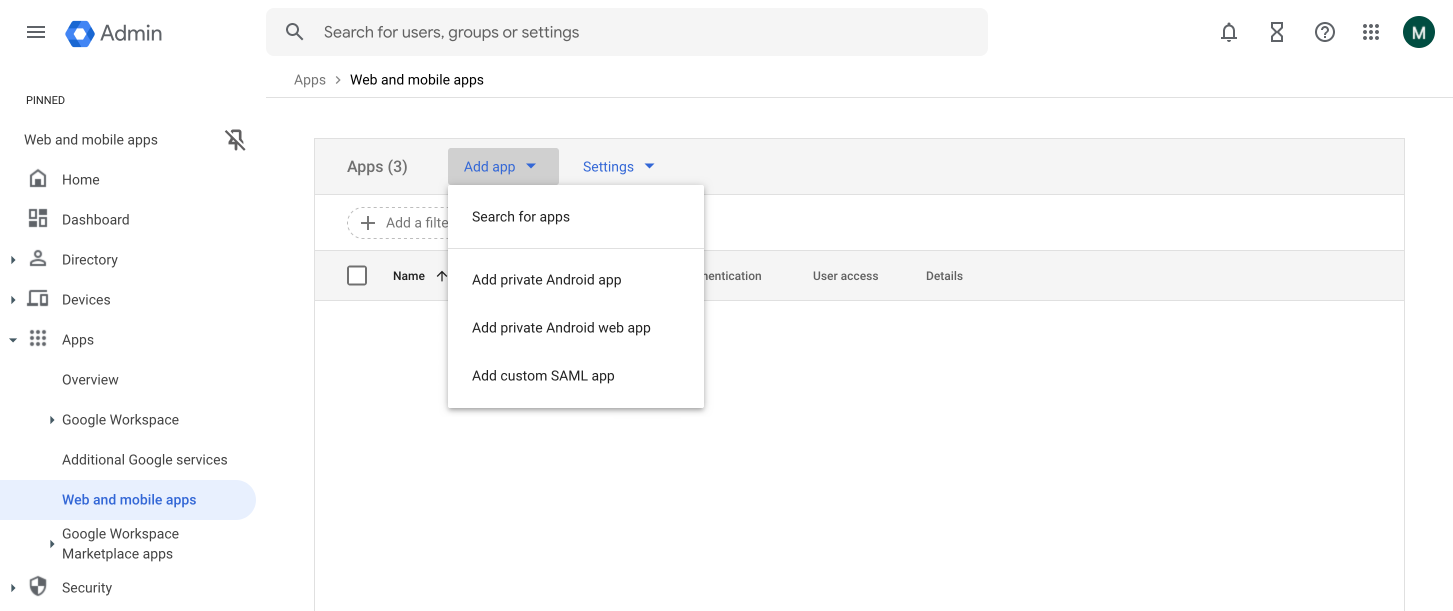 1. Log in to your Google Admin Console. In the menu on the left, click Apps (A) and then Web and mobile apps (B).