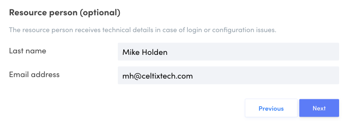 2. Optionally, assign a Resource person to receive technical details in case of login or configuration issues (recommended).