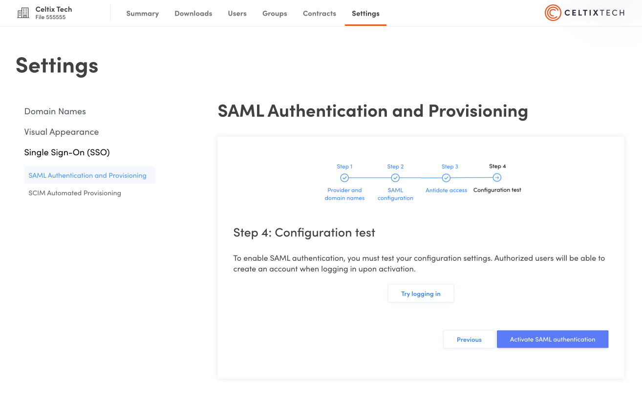 Choose this option to activate SAML authentication without automatically granting access to Antidote. You can grant users access to Antidote from the Users tab in the Client Portal.