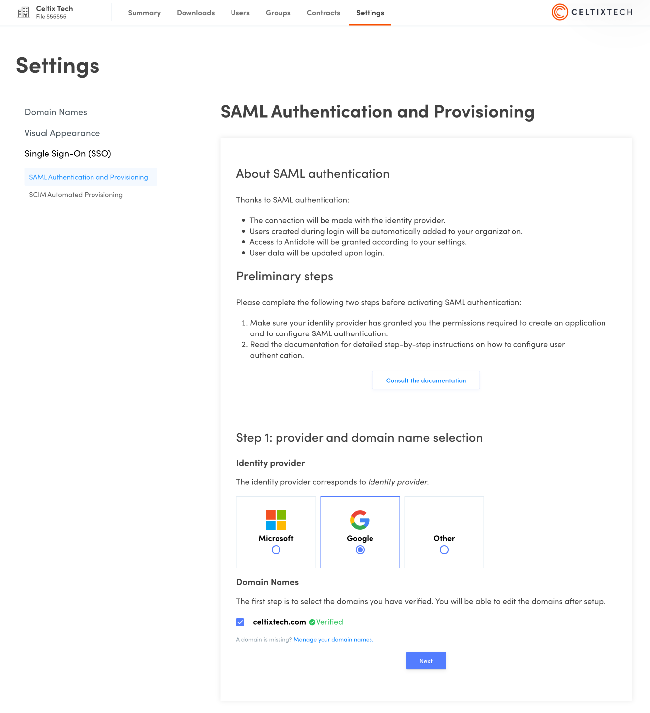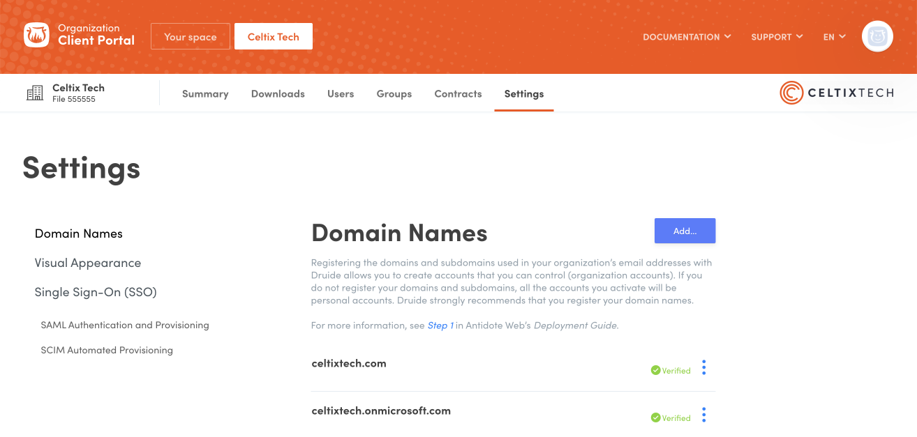 2. Make sure you have already added and verified all the domain names you need for SAML authentication. If you need to add a new one, follow the instructions in the Registering Domain Names section.
