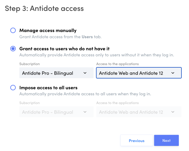 4. If your organization has one or more active subscriptions to Antidote, choose how you would like to manage Antidote access. You have three options: