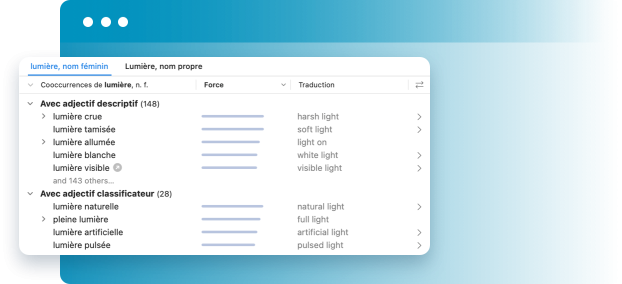 • Dictionary of semantic fields providing an overview of the lexical landscape for every word and several thousand expressions.